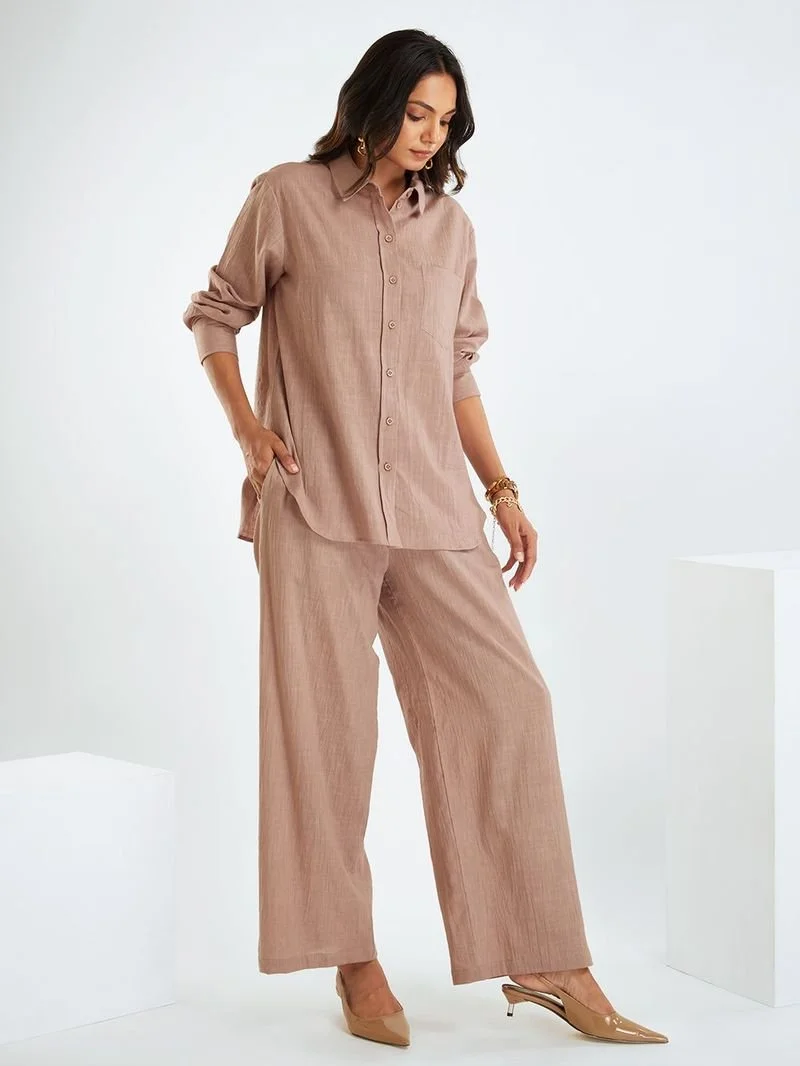 Soft, breathable, and effortlessly chic — our Old Rose Co-ord Set is made from premium cotton slub fabric for all-day comfort with elevated style. The button-down shirt boasts a relaxed silhouette, while the wide-leg pants provide a flowy movement and a flattering fit.